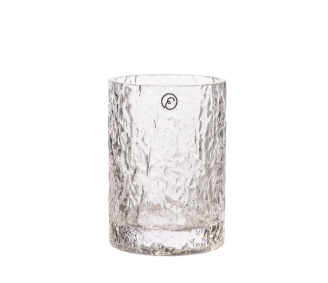 En liten glasvas med mönster som fångar ljuset.