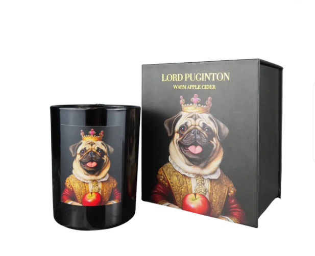 Doftljus i svart glas som sprider en varm och kryddig doft av äppelcider. Dekorativ etikett med motiv av en kunglig mops gör ljuset till en stilfull inredningsdetalj och en uppskattad present.