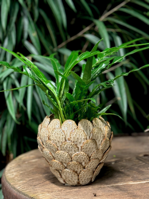 Kruka med bladmotiv är designad för att efterlikna naturens egna former, där krukan har detaljer som påminner om kaktusblad. Denna typ av kruka är ofta dekorativ och ger ett friskt, naturligt intryck till rummet.